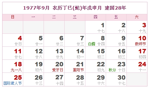 1977年9月 农历丁巳(蛇)年戊申月 建国28年