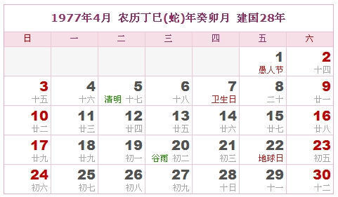 1977年4月 农历丁巳(蛇)年癸卯月 建国28年