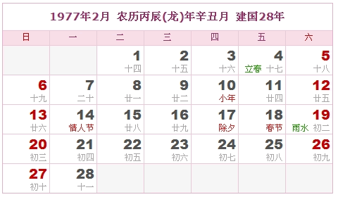 1977年2月 农历丙辰(龙)年辛丑月 建国28年