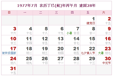 1977年7月 农历丁巳(蛇)年丙午月 建国28年