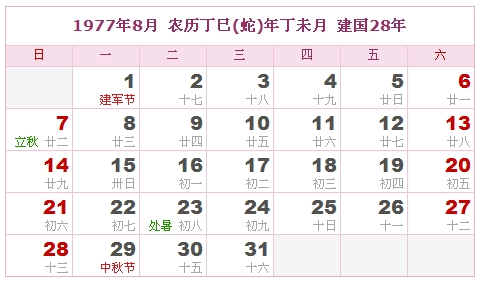 1977年8月 农历丁巳(蛇)年丁未月 建国28年