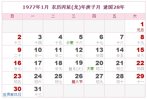 1977年1月 农历丙辰(龙)年庚子月 建国28年