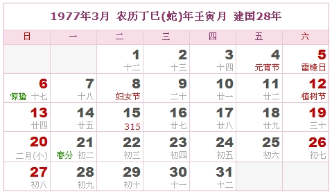 1977年3月 农历丁巳(蛇)年壬寅月 建国28年