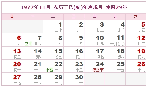 1977年11月 农历丁巳(蛇)年庚戌月 建国29年