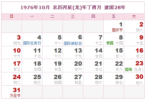 1976年10月 农历丙辰(龙)年丁酉月 建国28年