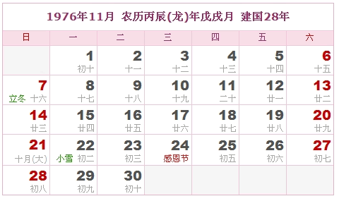 1976年11月 农历丙辰(龙)年戊戌月 建国28年