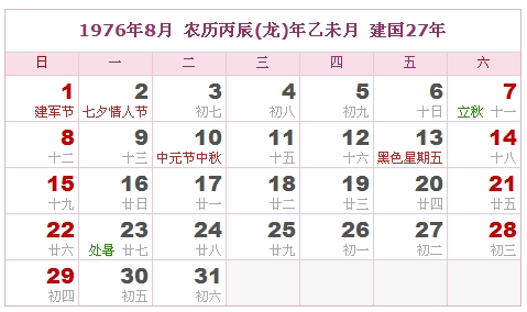 1976年8月 农历丙辰(龙)年乙未月 建国27年