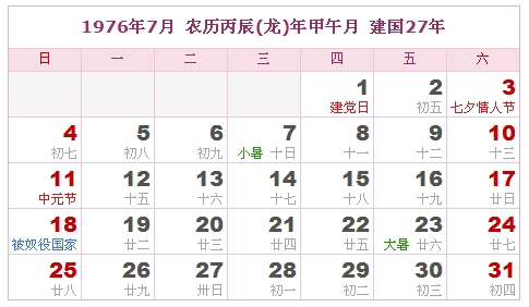 1976年7月 农历丙辰(龙)年甲午月 建国27年
