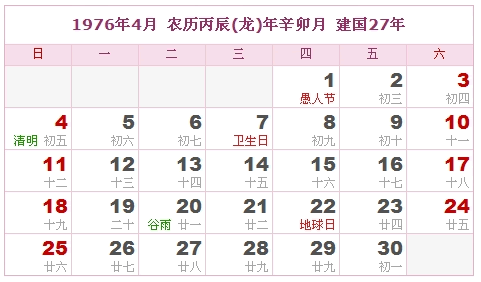 1976年4月 农历丙辰(龙)年辛卯月 建国27年