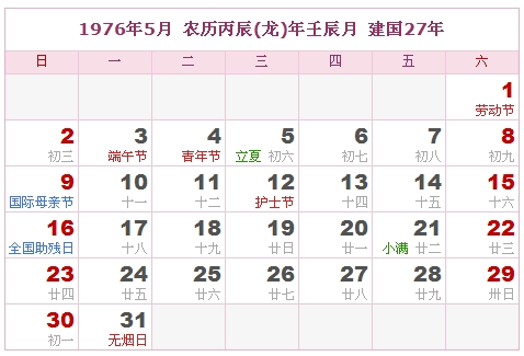 1976年5月 农历丙辰(龙)年壬辰月 建国27年