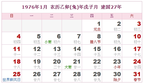 1976年1月 农历乙卯(兔)年戊子月 建国27年