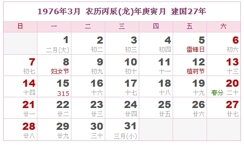 1976年3月 农历丙辰(龙)年庚寅月 建国27年