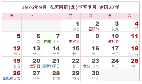 1976年9月 农历丙辰(龙)年丙申月 建国27年