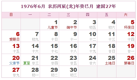 1976年6月 农历丙辰(龙)年癸巳月 建国27年