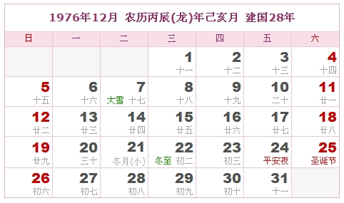 1976年12月 农历丙辰(龙)年己亥月 建国28年