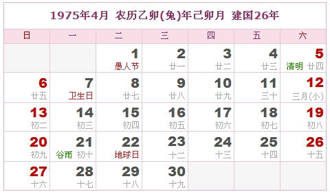 1975年4月 农历乙卯(兔)年己卯月 建国26年