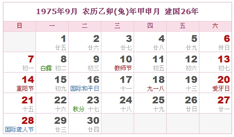 1975年9月 农历乙卯(兔)年甲申月 建国26年