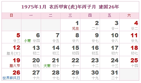 1975年1月 农历甲寅(虎)年丙子月 建国26年