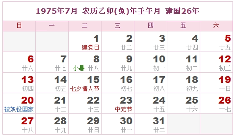 1975年7月 农历乙卯(兔)年壬午月 建国26年