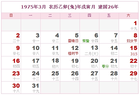 1975年3月 农历乙卯(兔)年戊寅月 建国26年