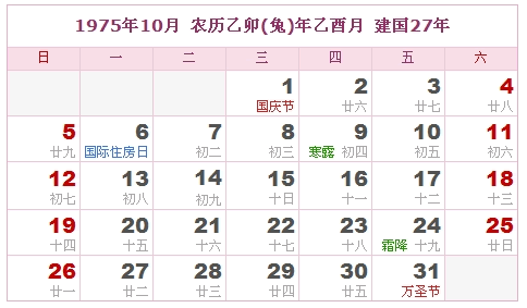 1975年10月 农历乙卯(兔)年乙酉月 建国27年