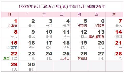 1975年6月 农历乙卯(兔)年辛巳月 建国26年