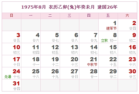 1975年8月 农历乙卯(兔)年癸未月 建国26年
