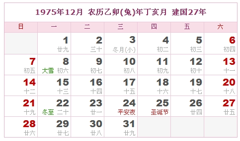 1975年12月 农历乙卯(兔)年丁亥月 建国27年
