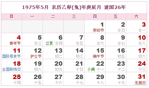 1975年5月 农历乙卯(兔)年庚辰月 建国26年