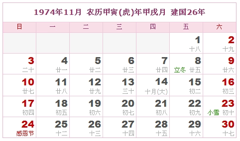 1974年11月 农历甲寅(虎)年甲戌月 建国26年