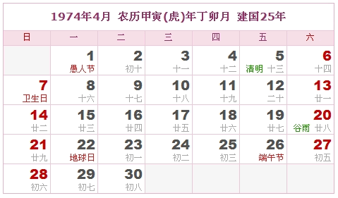 1974年4月 农历甲寅(虎)年丁卯月 建国25年