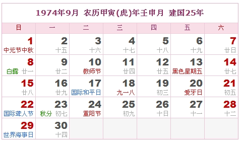1974年9月 农历甲寅(虎)年壬申月 建国25年