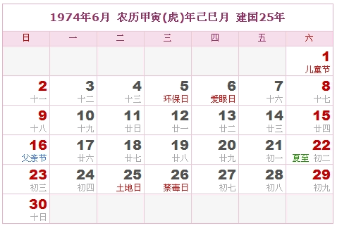 1974年6月 农历甲寅(虎)年己巳月 建国25年