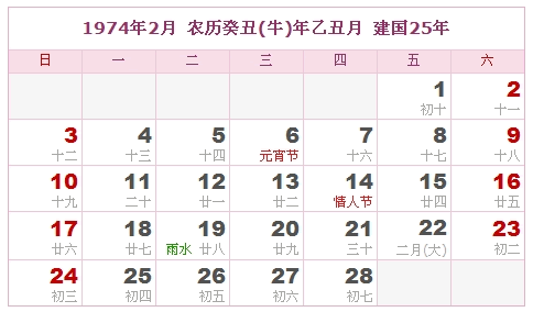 1974年2月 农历癸丑(牛)年乙丑月 建国25年