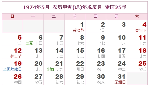 1974年5月 农历甲寅(虎)年戊辰月 建国25年