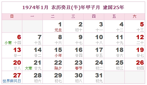 1974年1月 农历癸丑(牛)年甲子月 建国25年