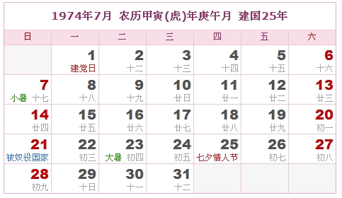 1974年7月 农历甲寅(虎)年庚午月 建国25年