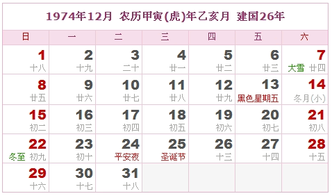 1974年12月 农历甲寅(虎)年乙亥月 建国26年