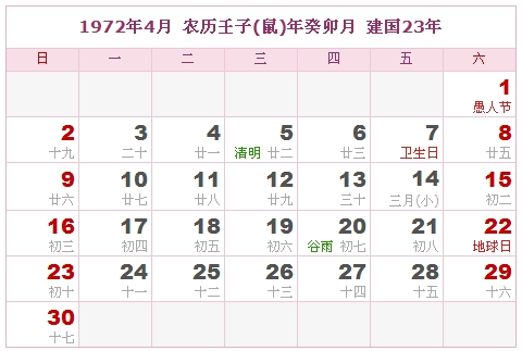 1972年4月 农历壬子(鼠)年癸卯月 建国23年