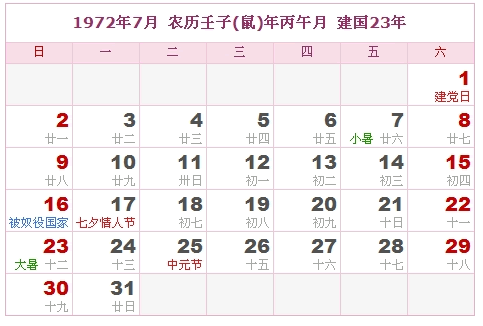 1972年7月 农历壬子(鼠)年丙午月 建国23年