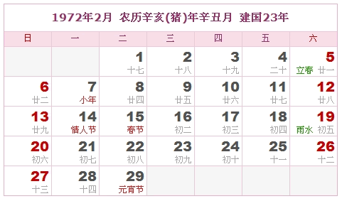1972年2月 农历辛亥(猪)年辛丑月 建国23年