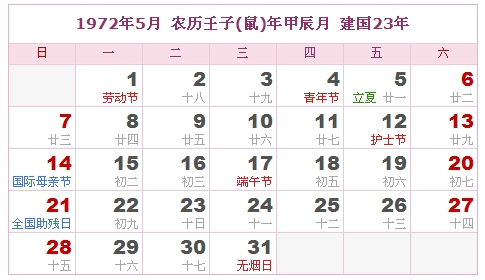 1972年5月 农历壬子(鼠)年甲辰月 建国23年
