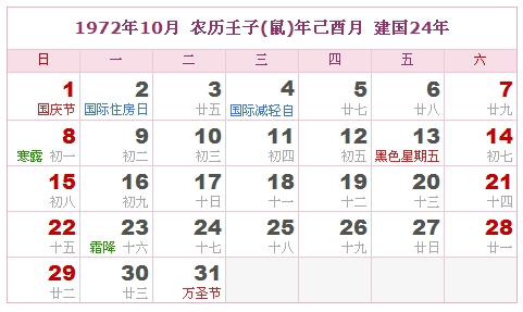 1972年10月 农历壬子(鼠)年己酉月 建国24年