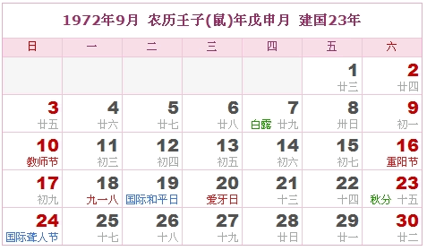 1972年9月 农历壬子(鼠)年戊申月 建国23年