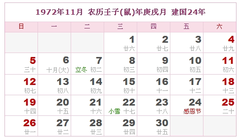 1972年11月 农历壬子(鼠)年庚戌月 建国24年