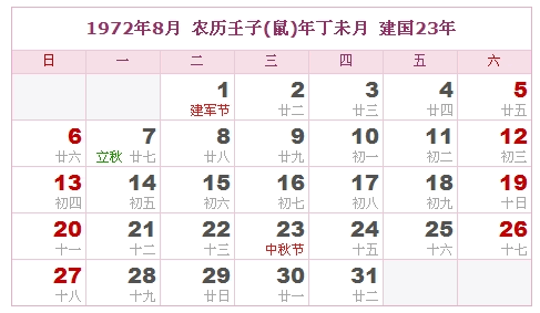 1972年8月 农历壬子(鼠)年丁未月 建国23年