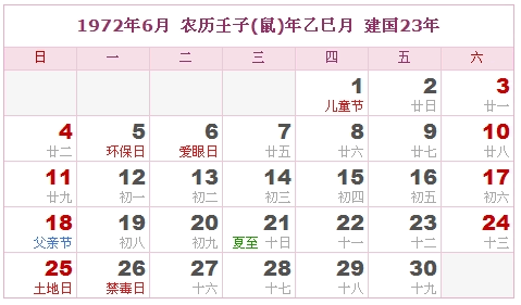 1972年6月 农历壬子(鼠)年乙巳月 建国23年