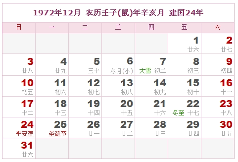 1972年12月 农历壬子(鼠)年辛亥月 建国24年