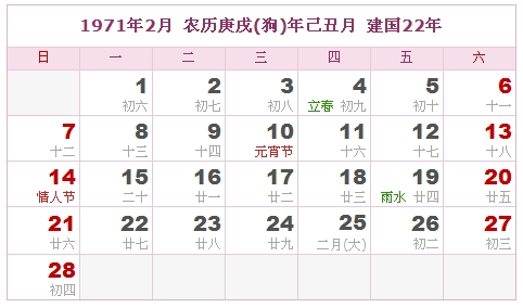 1971年2月 农历庚戌(狗)年己丑月 建国22年