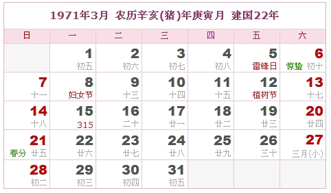 1971年3月 农历辛亥(猪)年庚寅月 建国22年